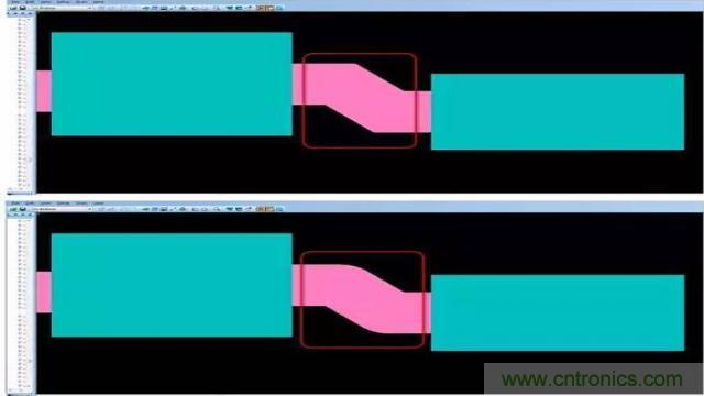 圖2:有效的PCB 設(shè)計(jì)工具會自動考慮用于繪制形狀的線型,以計(jì)算準(zhǔn)確的線條寬度,幫助您輕松創(chuàng)建尖拐角。