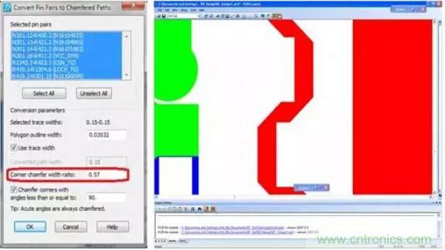 射頻和微波電路中經(jīng)常用到倒角,以減小饋線與電容器之間的分段不連續(xù)性電抗,從而改善MMIC 的頻率性能。90º 拐角與倒角之間的距離至關(guān)重要。因此,設(shè)計(jì)人員需要采用自動方法來基于設(shè)計(jì)指定需要生成的倒角比率。PCB 設(shè)計(jì)工具如果能夠基于設(shè)計(jì)規(guī)則自動強(qiáng)制實(shí)施需要生成的倒角比率,設(shè)計(jì)人員和工程師將會從中受益,在節(jié)省時間的同時提高設(shè)計(jì)質(zhì)量(圖3)。