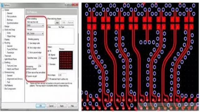 射頻設(shè)計(jì)的另一個重要方面是確保正確地屏蔽帶過孔的區(qū)域。盡管此任務(wù)可由設(shè)計(jì)人員手動進(jìn)行,但這個過程極其耗時。如果PCB 設(shè)計(jì)工具能夠自動完成此過程,將可以縮短設(shè)計(jì)周期時間并確保符合您的所有設(shè)計(jì)規(guī)則。利用此類工具,設(shè)計(jì)人員可以指定過孔模式生成規(guī)則,而將剩余的工作全部交由PCB 設(shè)計(jì)工具完成。