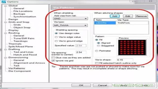 圖5:利用支持射頻設(shè)計(jì)的PCB 設(shè)計(jì)工具,您可以設(shè)置用于生成過孔模式的設(shè)計(jì)規(guī)則,并自動在您的設(shè)計(jì)中強(qiáng)制實(shí)施這些規(guī)則,從而節(jié)省您的時間和確保符合您的所有設(shè)計(jì)規(guī)則。