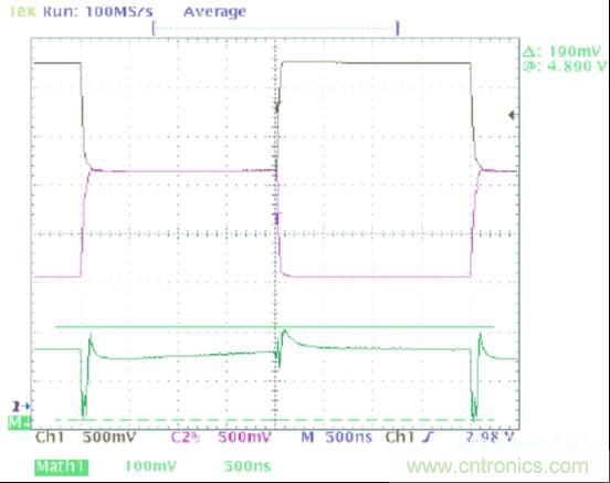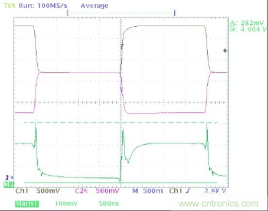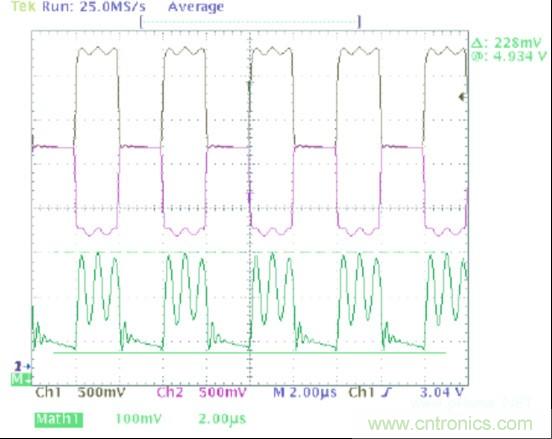 圖1中的波形顯示了一個可以在典型CAN收發器的輸出上觀察到的共模噪聲。在這幅圖像中,黑色軌跡線(通道1)顯示CANH,紫色軌跡線(通道 2)顯示的是CANL,并且綠色軌跡線(數據功能)是CANH與CANL的和。這個求和的過程給出了一個波形,它的值等于此時一個指定點上共模電壓的2 倍。