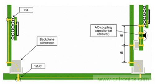 下圖所示是一個典型的高速信號互連鏈路,信號傳輸路徑包括:①發送端芯片(封裝與PCB過孔)②子卡PCB走線③子卡連接器④背板PCB走線⑤對側子卡連接器⑥對側子卡PCB走線⑦AC耦合電容⑧接收端芯片(封裝與PCB過孔)