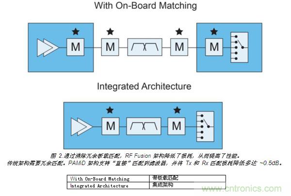 如圖 2 所示,每條通道上實現(xiàn)元件集成,無需對元件進行板載匹配,從而提升了性能。這將發(fā)射和接收的匹配損耗降低多達 0.5 dB,進而降低電流消耗和熱負荷。這種布局還在功率放大器的帶寬范圍內(nèi)集成相應(yīng)頻段的濾波器,確保了每個功率放大器能得到最高效的利用。每個模塊的改進性能使制造商更容易實現(xiàn)手機的整體性能目標(biāo)。