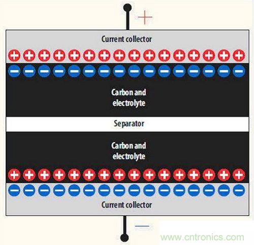 圖2是EDLC電容的橫截面圖。從圖中可以看到兩個由電解液包圍著的納米顆粒活性碳層,電解液中間則有一個“隔離”層。這兩個碳層與集電極相接觸,并由集電極將電流輸送到外部。這兩個碳層由兩個串聯(lián)電容組成,因此命名為雙層電容或DLC。由于電容內(nèi)的電荷載體實際上處于離子態(tài),因此使用了術(shù)語電化學(xué)DLC(或EDLC)。這張圖也顯示了簡單的原理,其中電荷主要集中在集電極-碳接口。電容(C)直接正比于有效面積(A),并反比于這些電荷(或C a A/d)之間的隔離距離(d)。雙層電容的正負(fù)電荷之間的間距在納米范圍,這正是EDLC電容容量如此大的原因(因為這個間距要比靜電電容的電荷間距小好幾個數(shù)量級)。