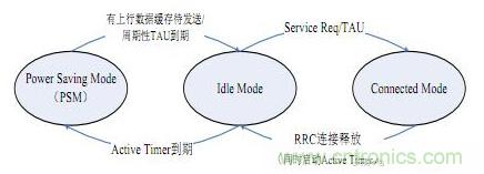 TAU周期請求定時器(T3412)由網(wǎng)絡(luò)側(cè)在ATTCH和TAU消息中指定,3GPP協(xié)議規(guī)定默認為54min,最大可達310H。那么UE處理完數(shù)據(jù)之后,什么時候進入PSM模式呢?這是由另一個定時器Activer Timer(T3324,0-255秒)決定的。UE處理完成數(shù)據(jù)之后,RRC連接會被釋放、進入空閑態(tài),與此同時啟動Active Timer,此Timer超時后,UE即進入上述PSM模式。轉(zhuǎn)換狀態(tài)如下(借圖):