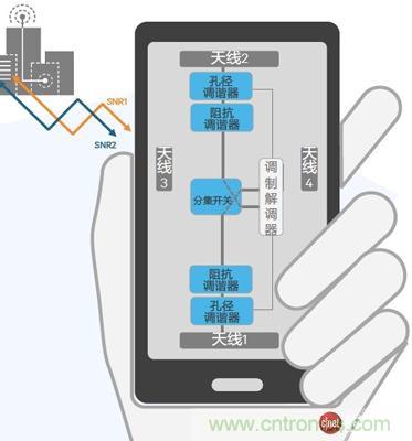 值得一提的是,高通的整合解決方案還支持載波聚合的TruSignal自適應(yīng)天線調(diào)諧技術(shù)。TruSignal可被看作是三項技術(shù)的總稱:第一是主分集天線切換,它是用來解決手機(jī)“死亡之握”的問題——手機(jī)的主天線一般是在手機(jī)的下方,當(dāng)人們用手握住它的時候,信號會掉得非常快,當(dāng)下方主天線被握死時,它可以將天線切換到上面的分集天線去;第二是天線調(diào)諧——天線調(diào)諧技術(shù)又包含兩類,一類叫孔徑調(diào)諧,一類叫阻抗調(diào)諧,通過調(diào)諧天線的匹配,可以解決天線和PA之間的適配問題;第三是高階分集接收——通過增加分集來提升接收性能,以及接收的下行速率。