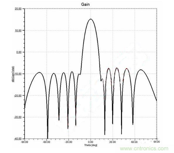 線陣增益為15.1dBi,副瓣電平-22.6dB。
