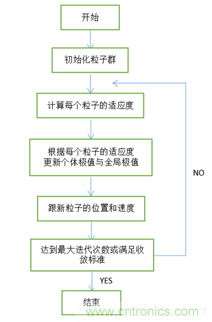 粒子群的基本概念是來自于鳥群覓食行為的研究[3]。與遺傳算法類似,粒子群算法也是一種隨機(jī)搜索方法,不同的是,粒子群優(yōu)化算法沒有選擇、交叉、變異等復(fù)雜過程,而是依靠個體間的協(xié)作來尋取最優(yōu)解。每個粒子通過跟蹤粒子本身找到的最優(yōu)解Pbest和群體找到的最優(yōu)解Gbest,更新離子的位置和速度,不斷向最優(yōu)解靠近,最終達(dá)到最優(yōu)解。粒子群算法優(yōu)化流程圖如圖7所示