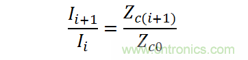 圖中Yo為連接功分網(wǎng)絡(luò)的串饋線陣等效導(dǎo)納,Zci為各阻抗變換段的特性阻抗,Zco為饋線的特性阻抗;串饋網(wǎng)絡(luò)輸出端口激勵電流與阻抗有如下的關(guān)系[4]