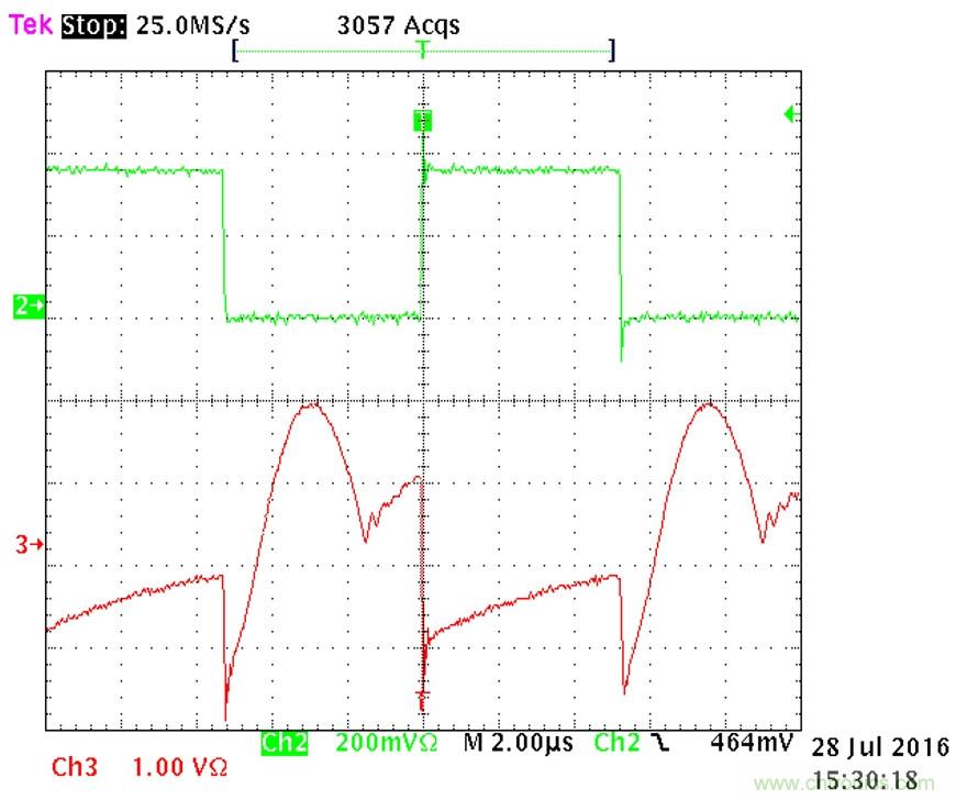 圖5:電流探頭會因為時間常數使輸入信號失真。上部(綠色)跡線為干凈的VDS,下部(紅色)跡線為失真的ID。