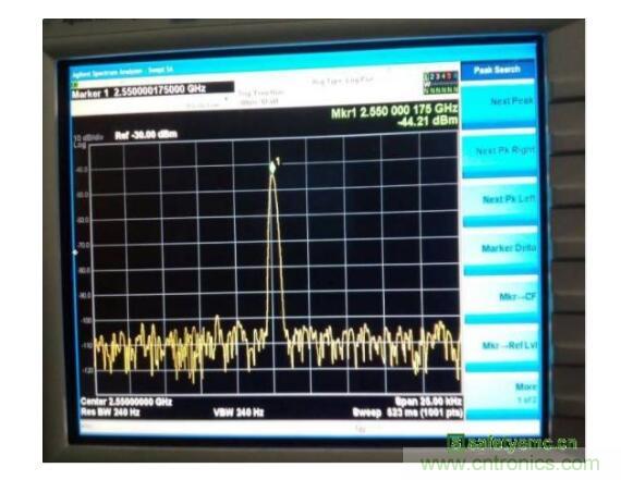 從測試結(jié)果來看,諧波超標(biāo)很嚴(yán)重,這一點與天線區(qū)域的雜訊信號很相似,考慮到傳導(dǎo)嫌疑已經(jīng)排除,因此分析的重點集中到了天線區(qū)域的非線性器件。從如圖4所示原理圖可以看出,天線的調(diào)諧開關(guān)是正常工作的,由于天線開關(guān)本身是非線性器件,因此首先確認(rèn)天線開關(guān)的影響。將天線開關(guān)旁路(天線仍然正常)如圖5所示,發(fā)現(xiàn)此時2.55GHz的雜訊可以降低到-55.7dBm左右,因此可以確定天線區(qū)域的雜訊就是調(diào)諧開關(guān)造成的。