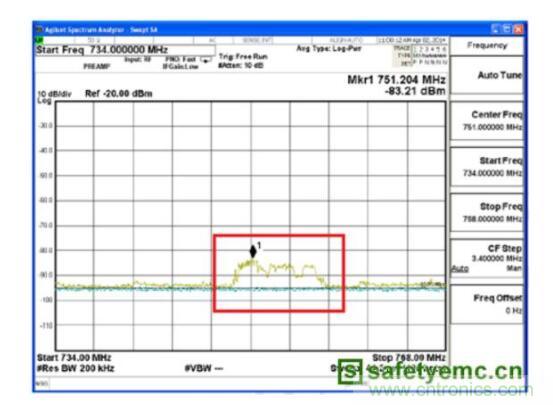 經(jīng)過查閱電源和芯片文檔得知其開關(guān)頻率的大約為1.9M,該頻率成分的電源噪聲會在調(diào)制過程中頻移到信號頻率兩側(cè)。然而由于使用較低靈敏度的探頭智能確定處板上下半部分都是可能的輻射雜散信號源,卻無法定位精確的位置。此時我們需要進(jìn)一步使用套件中精度更高的磁場環(huán)形探頭或者垂直向磁場探頭來確定最強區(qū)域。最終發(fā)現(xiàn)在750MHz+/-17MHz在紅色框標(biāo)示區(qū)域最強。測試結(jié)果請參考圖7所示,此處750MHz附近的近場輻射為-83.21dBm,2.25GHz處最大近場輻射為-44.18dBm。