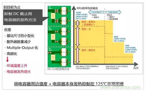 但是,近年來隨著Multiple-Output化(Tx增加)加速,一方面元件數(shù)量增加,而由于基站尺寸小型化,散熱器等散熱對(duì)策可用的空間越來越少。使用頻帶的進(jìn)一度高頻化,元件發(fā)熱進(jìn)一步增大,將電容器周邊溫度和自身發(fā)熱抑制在125℃,在電路設(shè)計(jì)上的制約案例中變得尤為顯著。
