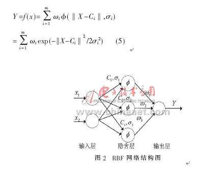 RBF神經網絡結構圖如圖2所示,第一層為輸入層,用作特征信息融合信息采集,構成輸入樣本空間X;第二層為隱含層,用作將輸入樣本空間映射為高維的徑向基函數空間,即對輸入信息空間X進行特征提取。隱含層節點參數向量包括中心值Ci和標準偏差δi;第三層為輸出層,ωi為第i個基函數與輸出節點的連接權值,輸出為Y,徑向基函數選擇高斯函數,如下: