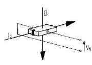在這兩個邊緣之間產生的霍爾電壓VH與控制電流IC和磁通量B直接成正比(圖1)。霍爾發(fā)生器由一片薄傳導材料制成,如鎵砷化物(GaAs),這種材料在使用期間能夠實現可靠穩(wěn)定的性能。在5 mA的控制電流下,獲得的霍爾電壓約為1.25 mV/mT。