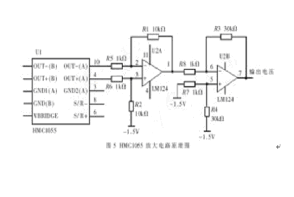 經(jīng)過上面的分析,使用雙運(yùn)算放大器來設(shè)計(jì)基本電路,將需要的電壓信號(hào)放大以進(jìn)行A/D轉(zhuǎn)換。圖5給出了一個(gè)HMC1052放大電路的典型方案。由于Vout=±4.875mV,ADC采樣在0~3V或者1.5±1.5V范圍內(nèi),這樣就允許運(yùn)算放大器調(diào)整其增益,以將±4.875mV的信號(hào)放大至±2.5V的ADC范圍內(nèi)。因此,運(yùn)算放大器的增益為: