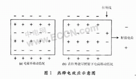 某些強(qiáng)介電物質(zhì)(PZT,LiTaO3等)的表面接受了紅外線的輻射能量,其表面產(chǎn)生溫度變化,隨著溫度的上升或下降,這些物質(zhì)表面上就會(huì)產(chǎn)生電荷的變化,這種現(xiàn)象稱為熱釋電效應(yīng)。圖1為晶體表面電荷隨溫度變化的移動(dòng)情況[1]。