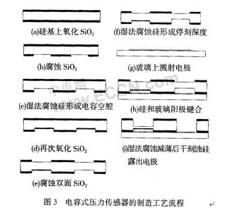 整個制造流程都采用標準工藝,如圖3所示。先熱氧化100 nm的SiO2,既作為腐蝕Si的掩膜,又作為電容兩電極的絕緣層。利用各向異性腐蝕形成電容空腔和將來露電極的停刻槽,如果硅片厚度一致且KOH腐蝕速率均勻,此法可以在相當程度上等效于自停止腐蝕。從玻璃上引出電容兩電極,然后和硅片進行陽極鍵合。鍵合片利用KOH腐蝕減薄后反應離子深刻蝕露出測量電極。