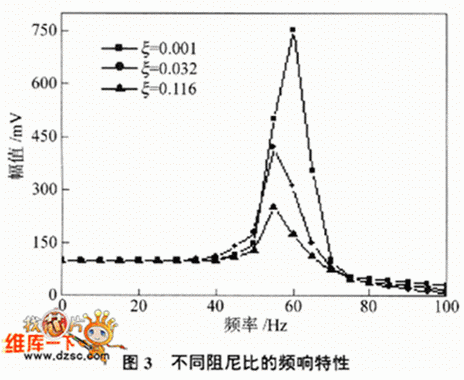 根據式(15)的光纖光柵加速度傳感器的數學模型,設計了固定頻率fn=67Hz的低頻光纖光柵加速度傳感器.彈性梁尺寸為L=80mm,h=1mm,b=5mm,材料選用碳纖維,彈性模量E=128GPa,質量塊m=8.8 g,布拉格光纖光柵在靜止狀態下的波長λB=1551.75nm,波長變化靈敏度80 pm•g-1,經過光電探測器轉化為電信號后的靈敏度為s=200mV.g-1.對傳感器的動態特性在ES-015振動臺上進行了實驗研究,圖3是在三種不同阻尼比ε時的幅頻特性實驗中給激振器旋加的加速度值為0.5g(g為重力加速度),整個測量頻帶是0~100Hz.從圖中可以看出:在l~45 Hz以下是加速度計的幅值平坦區,在45~65Hz是共振區,在65Hz以上是衰減區,所以選用1~45Hz作為其工作區;在共振區內加速度計的特性也與阻尼有關,隨著阻尼比的增加振動幅值呈下降趨勢,同時共振頻率也向低頻偏移,但阻尼比對幅值的影響比較顯著一些,所以通過選用適當的阻尼可以改變加速度計的共振區特性,防止其工作在共振區時由于幅值過大引起傳感器損壞.通常阻尼選在O.707附近,這與其他振動傳感器是相同的.