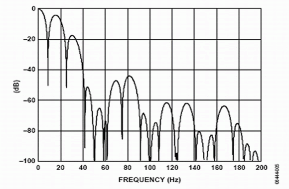Σ-Δ模數(shù)轉(zhuǎn)換器的內(nèi)置數(shù)字濾波器對于抑制帶外量化噪聲以及其他噪聲源非常有效。噪聲源之一是電力網(wǎng)供電系統(tǒng)產(chǎn)生的頻率。當(dāng)電力網(wǎng)為器件供電時,將產(chǎn)生50 Hz及其倍頻的供電系統(tǒng)頻率(在歐洲),或產(chǎn)生60 Hz及其倍頻的供電系統(tǒng)頻率(在美國)。窄帶模數(shù)轉(zhuǎn)換器主要采用sinc濾波器。AD7793有4個濾波器選項(xiàng),模數(shù)轉(zhuǎn)換器可以根據(jù)更新速率自動選擇需要使用的濾波器種類。在16.6 Hz的更新速率使用sinc3濾波器。如圖5所示,sinc3濾波器在頻譜內(nèi)存在凹槽。當(dāng)輸出字速率為16.6 Hz時,可以利用這些凹槽同時抑制50 Hz或60 Hz的頻率。