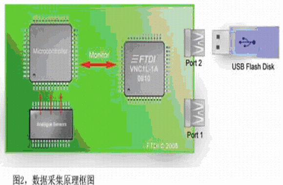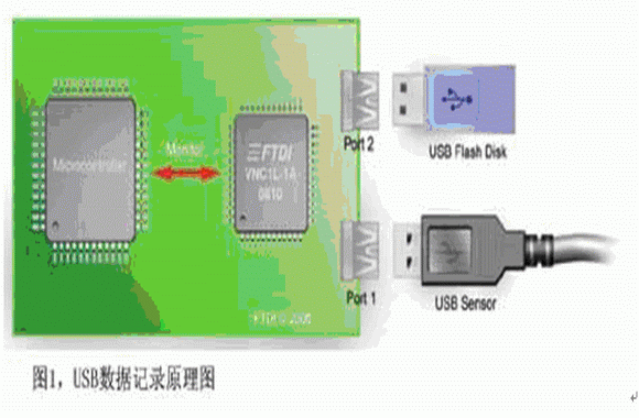 目前市場上有很多種數據采集設備可用于在PC上記錄數據,如National Instrument的LabVIEW,不過這類設備的傳感器件開始越來越多地采用USB接口而不是RS232或其他傳統接口。過去在嵌入式系統中應用USB設備需要性能相對較強的硬件,要帶有USB Host控制器接口、RTOS以及USB軟件驅動,結果因USB Host功能實施成本的原因設計工程師一直都不太愿意在小型8位或16位MCU系統上增加USB設備。但隨著最新一代智能USB Host控制器IC的推出,與MCU配合使用不僅可為PC應用使用USB數據采集設備,而且還可將數據存儲在低成本高容量的閃存盤上。