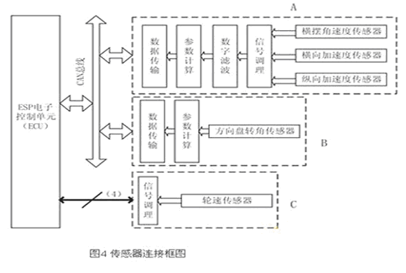 本文所作設(shè)計(jì)的框圖如圖4所示。在圖中,方向盤(pán)轉(zhuǎn)角傳感器信號(hào)經(jīng)微控制器處理后,通過(guò)CAN總線發(fā)送給ECU(圖4中B);橫擺角速度傳感器、縱向/橫向傳感器由于信號(hào)特點(diǎn)和安裝位置類(lèi)似,故設(shè)計(jì)在同一個(gè)模塊內(nèi)(圖4中A);由于ESP對(duì)輪速傳感器信號(hào)的實(shí)時(shí)性要求較高,故經(jīng)過(guò)信號(hào)調(diào)理后,直接送入ECU(圖4中C)。在圖4的A和B中,需要微處理器對(duì)信