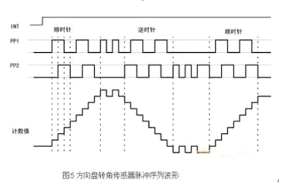 方向盤(pán)轉(zhuǎn)角傳感器的輸出為正交編碼脈沖。正交編碼脈沖包含兩個(gè)脈沖序列,有變化的頻率和四分之一周期(90°)的固定相位偏移,如圖5所示。通過(guò)檢測(cè)2路信號(hào)的相位關(guān)系可以判斷為順時(shí)針?lè)较蚝湍鏁r(shí)針?lè)较颍?jù)此對(duì)信號(hào)進(jìn)行加/減計(jì)數(shù),從而得到當(dāng)前的計(jì)數(shù)累計(jì)值,也即方向盤(pán)的絕對(duì)轉(zhuǎn)角,而轉(zhuǎn)角的變化率即角速度,則可通過(guò)信號(hào)頻率測(cè)出。另外,方向盤(pán)轉(zhuǎn)角傳感器有一個(gè)零位輸出信號(hào),當(dāng)方向盤(pán)在中間位置時(shí),該信號(hào)輸出0V,否則輸出5V,通過(guò)該信號(hào),可對(duì)絕對(duì)轉(zhuǎn)角進(jìn)行在線校準(zhǔn)。