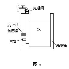 圖5是PS壓力傳感器在全自動(dòng)洗衣機(jī)中的應(yīng)用實(shí)例。如圖所示,利用氣室,將在不同水位情況下水壓的變化,作為空氣壓力的變化檢測(cè)出來,從而可以在設(shè)定的水位上自動(dòng)停止向洗衣機(jī)注水。