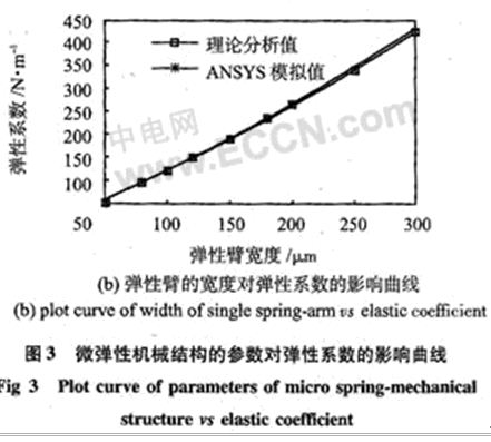 分別用理論方法和ANSYS數(shù)值模擬方法得出了在b=200μm時彈性系數(shù)k隨微結(jié)構(gòu)厚度h的變化情況,以及在h=50 μm時彈性系數(shù)k隨彈性臂寬度b的變化情況,分別如圖3(a),(b)所示。圖3(a)中,2種計算方法求出的彈性系數(shù)的平均相對誤差為0.86%,圖3(b)中平均相對誤差為1.06%。可見2種方法計算出來的結(jié)果基本吻合。從上述分析可知,在彈簧臂總長確定的情況下,彈簧的彈性系數(shù)取決于微結(jié)構(gòu)的厚度h和彈性臂的寬度b,而且,和6的關(guān)系近似于線性,因此,可以根據(jù)動力學系統(tǒng)的具體要求和加工的工藝性能來選擇合理的h和b,從而滿足傳感器整體性能的要求。