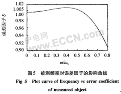 式中a′和a分別為加速度的測得值和真實值。δ和阻尼比ζ與被測物體的頻率ω有關(guān),當ζ=0.65~0.07時,ζ最接近1,因此,取ζ=0.65進行計算機模擬,結(jié)果如圖5所示??梢钥闯觯罕粶y頻率比較小的時候測得的加速度值更接近于真實值,當ω/ωn=0.2時,ζ=1.0054,因此,傳感器在設定的頻率范圍1~4.5 kHz的誤差不大于0.54%。
