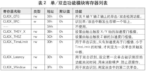 諾基亞8800CA手機除了有“翻轉靜音”的功能外,還有雙擊手機顯示時鐘的功能。其中敲擊的識別可以通過加速度傳感器來實現。LIS35DE集成了識別單擊或雙擊的功能模塊,通過寄存器設計就可以識別出單擊以及兩次單擊是否符合雙擊的條件。LIS35DE的單雙擊功能由地址為38h~3Fh的寄存器控制,如表2所示。