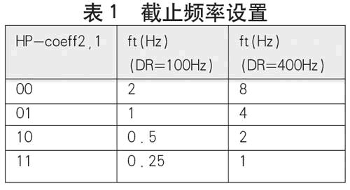 由于重力的存在,用戶不能簡單地在FF_WU_TSH1寄存器中設置統一的門檻值來作為晃動或者喚醒中斷的判定條件。為此,LIS35DE集成了高通濾波器,能夠濾除緩慢變化或不變的加速度(如重力加速度),并且可以選擇截止頻率,如表1所示。只有變化頻率高于截止頻率的加速度才能通過。
