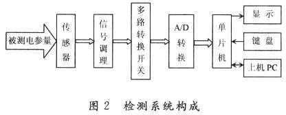 檢測系統(tǒng)構(gòu)成如圖2,被測量經(jīng)霍爾傳感器轉(zhuǎn)換為電壓信號(hào),經(jīng)信號(hào)調(diào)理電路和多路轉(zhuǎn)換開關(guān)選擇,通過A/D轉(zhuǎn)換器送給單片機(jī),單片機(jī)采用89C51,是該系統(tǒng)的主控器,鍵盤選用2×4鍵盤,用于選擇被測量的種類,采用數(shù)碼管或液晶顯示被測量的大小。