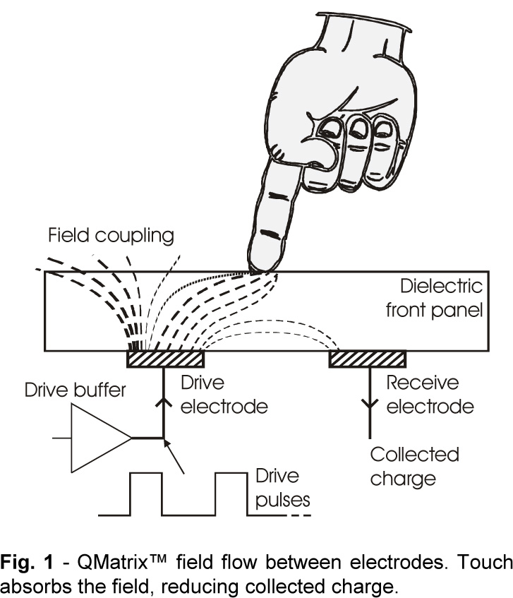 圖1 :兩個電極之間的 QMatrix 場流。觸摸可吸收該電場,導致所收集的電荷減少。