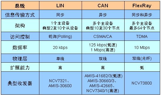 可以應用于汽車中的系統總線有多種,如控制器區域網絡(CAN)、本地互連網絡(LIN)及FelxRay等。這些總線的特點各不相同,表1比較了汽車應用中幾種常見的系統總線,并列出了典型的安森美半導體總線收發器產品。