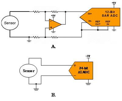 24 位Δ-Σ (B) 顯示的是一個(gè)直接連接至轉(zhuǎn)換器的傳感器。