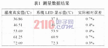 試驗數據通過對普通熱水器加熱中的水溫進行測量取得,測量中采用實驗用高精密數字測溫儀的示值溫度作為被測物體溫度檢測點的溫度真實值,本測溫裝置測得的溫度信息經過電路的轉換及單片機的處理后,測得的溫度信息在LED數碼管上的顯示值如表l所示。從表中的數據可以看出,本系統LED顯示值和真實值很接近;試驗過程中,由于測量環境及其它因素的影響,使得系統的測量值在真實值上下波動,但溫度的實際相對誤差始終保持在1%以內,從而證明了本測溫裝置完全能夠滿足實際的測量要求。