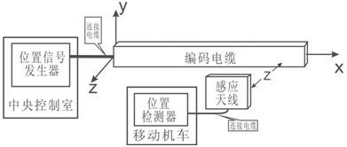 自動(dòng)控制系統(tǒng)中,必須解決兩個(gè)基本問(wèn)題:a.控制和受控雙方可靠的數(shù)據(jù)通信;b.移動(dòng)機(jī)車(chē)所在位置的位置檢測(cè)。感應(yīng)無(wú)線位置檢測(cè)系統(tǒng),將感應(yīng)無(wú)線數(shù)據(jù)通信和位置檢測(cè)融合在一個(gè)系統(tǒng)中,它由位置信號(hào)發(fā)生器、編碼電纜、感應(yīng)天線、位置檢測(cè)器組成。其中感應(yīng)天線箱安裝在移動(dòng)機(jī)車(chē)上隨機(jī)車(chē)移動(dòng),且始終與編碼電纜保持距離z;編碼電纜部分由編碼電纜、連接電纜、匹配阻抗構(gòu)成。感應(yīng)無(wú)線位置檢測(cè)系統(tǒng)框圖如圖1所示。