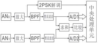 感應(yīng)無(wú)線位置檢測(cè)系統(tǒng)電路框圖如圖5所示。當(dāng)中控室地面局開(kāi)始發(fā)送載波信號(hào)時(shí),DCD=1;CPU檢測(cè)到DCD后,對(duì)2PSK解調(diào)輸出檢測(cè),將第1個(gè)1作為起始位進(jìn)行串行數(shù)據(jù)接收,得到APD位置數(shù)據(jù)g;在檢測(cè)G0的時(shí)間段,啟動(dòng)A/D1和A/D2,從A/D1和A/D2讀出接收線圈0接收的信號(hào)幅度A(AN0)和接收線圈1接收的信號(hào)幅度A(AN1),將各數(shù)據(jù)代入公式(5)~(8),可得移動(dòng)機(jī)車(chē)位置ADD。