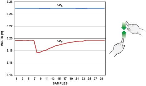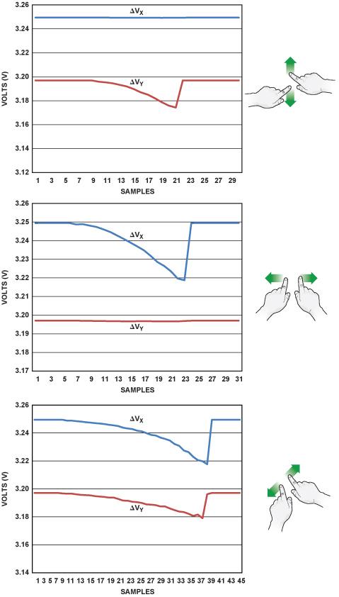 圖 3 顯示了一個沿著垂直(Y)軸捏合的例子。當手勢開始時,其中一層的兩根電極之間的電壓恒定不變,另一層則表現出階躍性降低,然后隨著手指相互靠近而提高。