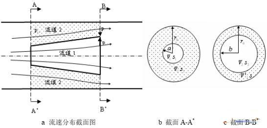 如圖2所示,流體在異徑管內外被分為流道1和流道2,在這里,r0為管路半徑,a、b分別為內流道入口和出口處半徑,忽略異徑管厚度,因此a、b也是外流道的進出口處內徑,假設從截面A-A*到截面B-B*流線不發生增加或者減少,即任何A-A*面上一微元ds都可以沿著流線找到在B-B*面上的映射 ds*,則在流道1內任一流線上有: