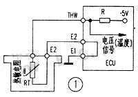 安裝好冷卻液溫度傳感器,將傳感器的連接器插好。當點火開關置于 ON 位置時,測量圖 1 中連接器“ THW ”端子 ( 豐田車 ) 或 ECU 連接器“ THW ”端子與 E2 間輸出電壓。所測得的電壓應與冷卻液溫度成反比變化。
