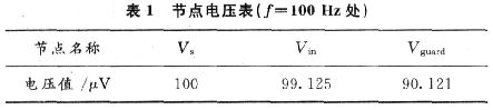 對圖2所示的電路,用PSpice仿真軟件對電路進行模擬分析,交流掃描的結果如下,各關鍵節點電壓如表1所示,電阻R1的低阻抗端加上了90.121μV的保護電壓,流經電阻R1的分流電流為90.031 fA。