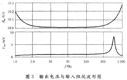 如圖3所示,圖中上半部分為系統輸出信號波形,下半部分為系統輸入阻抗波形,從圖中可以看出,在頻率為100 Hz處,測量系統的輸出電壓值Vout為10.011 mV,交流輸入阻抗Rin為1.132 8 GΩ。經計算,系統的放大倍數A為100.998倍。