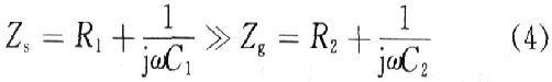 式中:Zs表示信號路徑的阻抗,Zg表示保護電路阻抗,本設計中,R2=100 kΩ,C2=1μF,Zs/Zg=1 000。