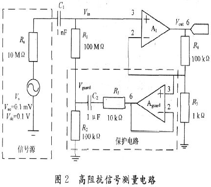 圖2中下側虛線框內的電路為保護電路,從放大器A1的反相輸入端引入信號到保護放大器Aguard的正相輸入端,保護放大器實則為電壓跟隨器。電阻R1的低電位端加上保護電位Vguard,當R2>>R3時。在一定頻率范圍內,保護電位近似等于高阻抗輸入端電位Vin,可以通過調節R2,R3的阻值來改變保護電位的大小。保護電位由保護緩沖放大器提供,而不是由信號源提供.電阻R1的低阻抗端加上保護電位后,其電壓降將大大減小,流經它的電流也將大大減小。