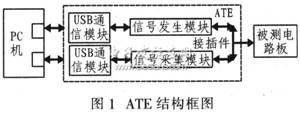 ATE測(cè)試的原理就是向電路板輸入測(cè)試向量,獲取相應(yīng)的輸出向量,將此輸出向量與正常的響應(yīng)向量相比較,結(jié)果一致表明電路板無故障,否則表明該電路板已損壞。整個(gè)過程由ATE自動(dòng)完成,因此效率高,但測(cè)試向量的完備與否對(duì)故障診斷結(jié)果有重要影響。該ATE設(shè)備是針對(duì)某電子裝備系統(tǒng)而研發(fā)的,其結(jié)構(gòu)框圖如圖1所示。