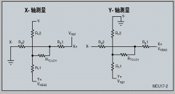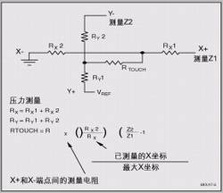 四線和八線觸摸屏可以測量出接觸電阻,即圖5中的RTOUCH。RTOUCH與觸摸壓力近似成正比。要測量觸摸壓力,需要知道觸摸屏中一層或兩層的電阻。圖6中的公式給出了計算方法。需要注意的是,如果Z1的測量值接近或等于0(在測量過程中當觸摸點靠近接地的X總線時),計算將出現(xiàn)一些問題,通過采用弱上拉方法可以有效改善這個問題。