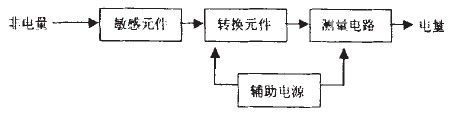 傳感器是將各種非電量(包括物理量、化學量、生物量等)按一定規律轉換成便于處理和傳輸的另一種物理量 (一般為電量)的裝置。傳感器一般由敏感元件、轉換元件和測量電路三部分組成,有時還需外加輔助電源。 傳感器方框圖如圖1所示。