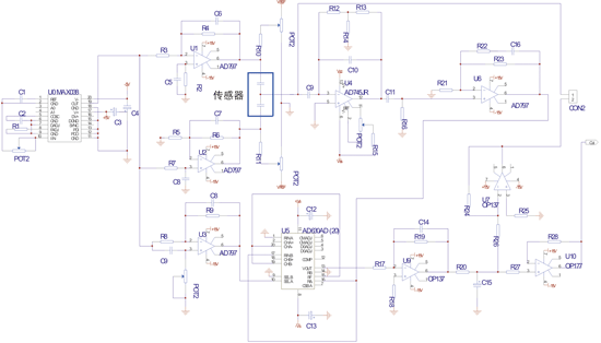 具體電路如圖7所示:U0(MAX038)信號發生器芯片產生1MHz的正弦交流信號;U1(AD797)運算放大器組成反相比例放大器,U2(AD797)運算放大器組成同相比例放大器。1MHz的交流信號經U1、U2后,變為大小相等、方向相反、相位相差180o的二個交流激勵信號,用來激勵差分電容傳感器;U4(AD745JR)是高輸入阻抗電荷轉移放大器。U4是調理電路的中心,在外加激勵信號的作用下,傳感器振動引起的電荷轉移成電壓信號的變化。R12、R13、R14采用T型連結,目的是提升電路阻抗和電路系統放大倍數。U6(AD797)運算放大器是 將C11、R16組成的高通濾波器去除低頻干擾后的電壓信號經適當放大,為下一步同步解調作好準備;U3(AD797)運算放大器組成的移相電路,其作用是使調制信號和解調信號同步;U5同步解調器,采用ADI公司生產的平衡解調器AD630,經U5同步解調出的電壓信號就是反應振動加速度大小的信號;U9(OP137)運算放大器組成二階有源低通濾波器,濾除信號中高頻噪音成份;U10(OP177)運算放大器組成 跟隨器,信號經調整后跟隨輸出。